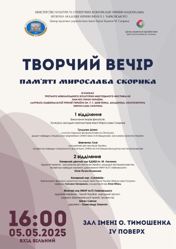5-7 травня в Національній музичній академії України імені П. І. Чайковського відбудеться третій Skoryk FEST
