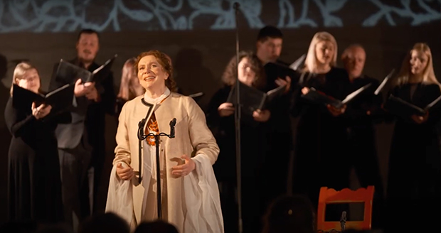 Голос співачки і акторки Наталії Половинки – як та нитка основи, що з’єднує все полотно дійства і, одночасно, гаптує узор малюнку: переплітається з хором, тримає напругу задуму, веде перемовини з простором, намацує вібраційні просвіти, плете вузли приголосних, нанизує вервиці слів…