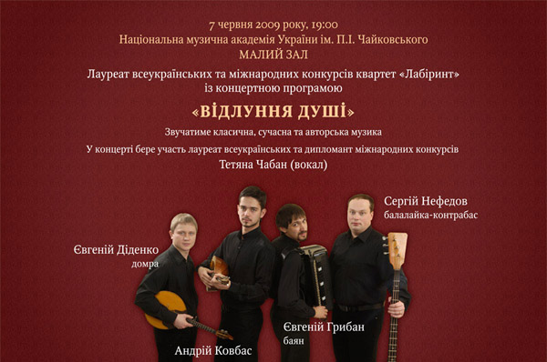 7 червня на сцені Малого залу Національної музичної академії України ім.П.І.Чайковського відбувся концерт під назвою "Відлуння душі"! Його організаторами і одночасно виконавцями виступили музиканти квартету народних інструментів "Лабіринт": Євгеній Діденко (домра), Андрій Ковбас (домра), Євгеній Грибан (баян) та Сергій Нефедов (балалайка-контрабас). Всі вони вихованці музичної академії.
