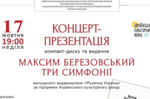 17 жовтня о 19:00 Видавництво Музична Україна концерт-презентацію компакт-диска та видання «Максим Березовський. Три симфонії» за участі Національного камерного ансамблю «Київські солісти» під орудою всесвітньо відомого диригента Кирила Карабиця, який є музичним редактором і упорядником видання.