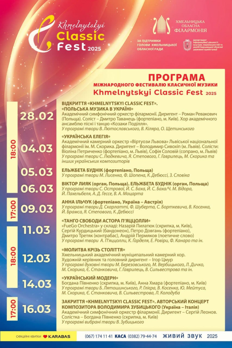Уже з 28 лютого розпочинається музичний марафон, що втілиться у цілій низці яскравих творчих імпрез в рамках "Khmelnytskyi Classic Fest-2025".