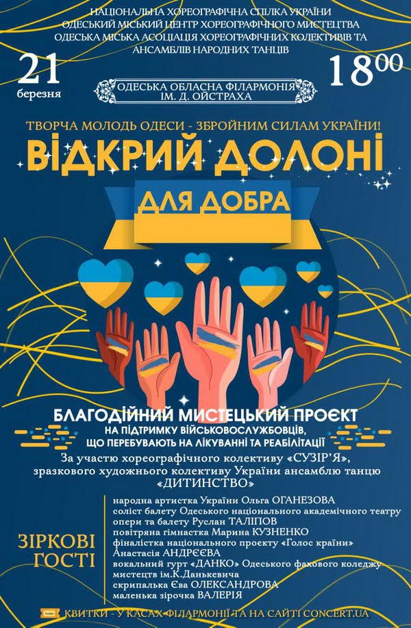 В Одеській філармонії 21 березня відбудеться благодійний мистецький проект "Відкрий долоні для добра" на підтримку військовослужбовців, що перебувають на лікуванні та реабілітації.