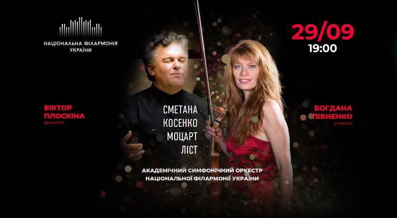 29 вересня у Колонному залі ім. М. Лисенка виступлять Симфонічний оркестр Національної філармонії України під орудою диригента Віктора Плоскіни, солістка – Богдана Півненко, скрипка.