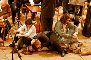 Так, на початку вистави з’явилися два персонажі, які, пройшовши через глядачевий зал, розташувалися на сцені поряд із диригентом на його подіумі.