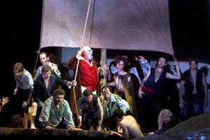 Уся перша дія оповита морською романтикою й наділена виразними символічними деталями. Мальовничо виглядає поява серед бурхливих хвиль команди корабля Даланда, полотняний парус якого ледь тримається під поривами вітру. Хочеться особливо відзначити роботу режисера з хором, який не лише демонструє свою високу майстерність як музичний колектив, а й активно діє у всіх складних сценічних ситуаціях.