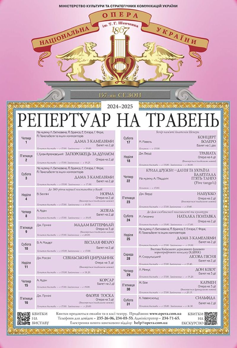 До уваги глядачів і довгоочікуване поновлення балету «Дама з камеліями», і гала-концерти – «Крила дружби – Данія та Україна» та пам’яті видатного балетмейстера Анатолія Шекери. Не забули в театрі і про національний репертуар – опери «Наталка Полтавка» та «Запорожець за Дунаєм» завжди збирають аншлаги. І звичайно ж на глядачів чекає зустріч з улюбленими артистами в шедеврах світового та українського оперного і балетного репертуару. І хоча вистави все ще залишають виключно «денними» (інформація про початок вистави указана в афіші та на сайті театру), а кількість глядачів в залі все ще обмежена, вистави травневої афіші нададуть позитиву та наснаги на звершення будь-якої складності!