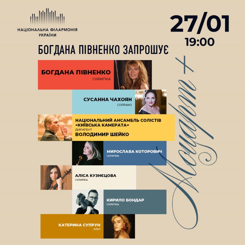 Отже, Моцарт+ Національний ансамбль солістів «Київська камерата», диригент Володимир Шейко плюс зіркові музиканти: Богдана Півненко, скрипка та Сусанна Чахоян, сопрано; Мирослава Которович, скрипка та ще одна іменинниця Аліса Кузнєцова, скрипка; Кирило Бондар, скрипка та Катерина Супрун, альт.