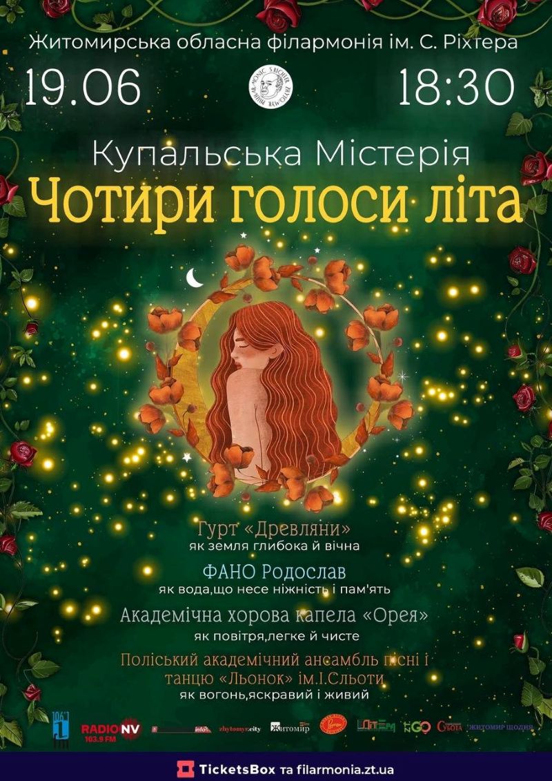 У ніч, коли сонце зустрічається з водою, оживає Купальська сила. Житомирська обласна філармонія ім. С. Ріхтера запрошує тебе 19 червня о 18:30 на особливий концерт — «Купальська містерія: Чотири голоси літа».