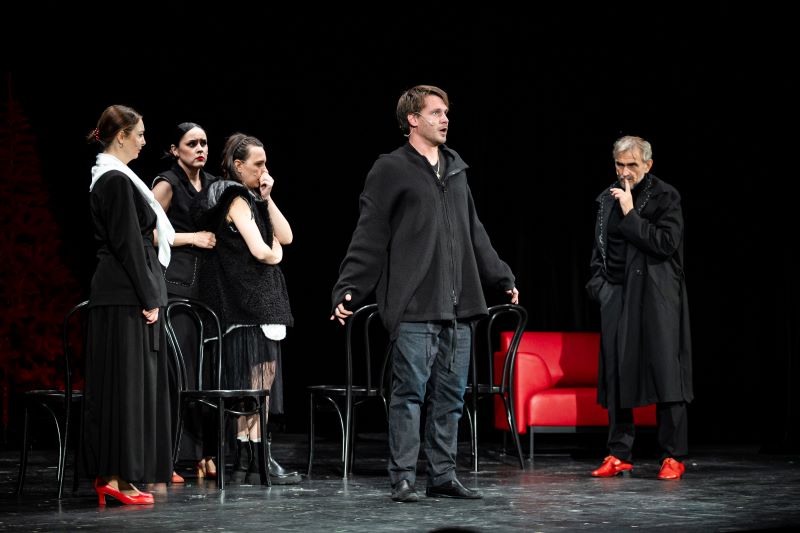 - Розкажіть про музичну частину постановки? Мінімалістична сценографія (криваво-червоні ялинки, шість стільців і червоний диван-крісло). Це через те, щоб виставу простіше було показувати на гастролях та фестивалях?