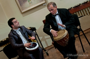 На одній сцені зі студентами виступив і їхній викладач Олександр Блінов: разом з іще одним вихованцем – Арменом Костандьяном він виконав цікаву, з елементами театру, авторську «Шкіряну розмову» для джембе та дарабуки.