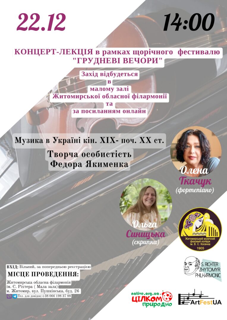 22 грудня о 14:00 у малій залі філармонії на вас чекає концерт-лекція під назвою - "Музика в Україні кін. ХІХ - поч. ХХ ст. Творчість Федора Якименка".(вхід вільний за попередньою реєстрацією).