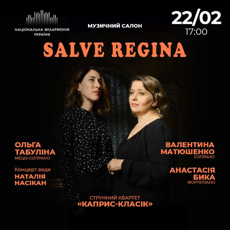 22 лютого солістки філармонії Валентина Матюшенко | сопрано та Ольга Табуліна | мецо-сопрано запрошують на красивий концерт «Salve Regina» у супроводі Анастасії Бика | клавесин та Струнного квартету «Каприс-класік». Salve Regina – один із чотирьох спеціальних гімнів Божій Матері, які традиційно були частиною Літургії. У цьому концерті прозвучать два твори на тексти цього традиційного антифону різних авторів: італійського композитора, родоначальника неаполітанської оперної школи і батька знаменитого композитора Доменіко Скарлатті – Алессандро Скарлатті та німецького композитора пізнього бароко, співака, викладача музики й найбільшого представника неаполітанського стилю – Йоганна Адольфа Хассе.