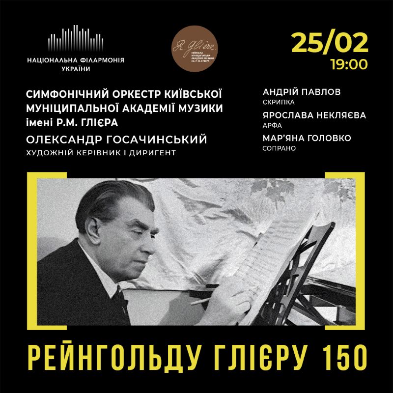 25 лютого меломанів і правдивих киян запрошує Симфонічний оркестр КМАМ імені Рейнґольда Глієра під керівництвом Олександра Госачинського відзначити концертом «Рейнґольду Глієру 150» – ювілей композитора, диригента, педагога, чиє ім’я носить Київська муніципальна академія музики. Андрій Павлов, скрипка;