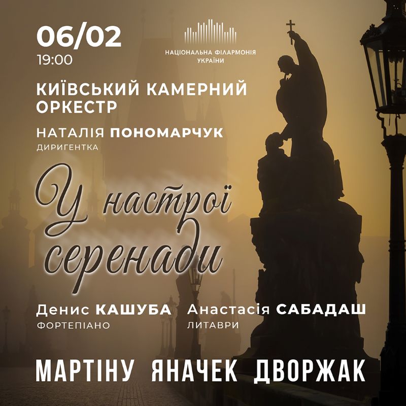 6 лютого в програмі «У настрої серенади» – Київський камерний оркестр під орудою Маестро Наталії Пономарчук пропонує свій унікальний погляд на чеську музику ХХ та ХІХ століть. Саме так: рухаючись від музики модерніста Богуслава Мартіну до Леоша Яначека та Антоніна Дворжака слухач занурюватиметься у підвалини чеської класичної музики. Подвійний концерт Мартіну, де сольними інструментами виступають фортепіано та литаври, маркує інтерес композитора до актуального тоді модернізму з його жорсткими урбаністичними звучаннями, залізобетонним ритмом та цікавими тембровими поєднаннями. Ранній твір Яначека з одного боку видає захоплення сучасним йому Вагнером із характерними млосними гармоніями та густим плетивом мелодій. А з іншого – увагу до запального танцювального фольклору Моравії. Серенада Дворжака захоплює поєднанням яскравих ліричних тем та по-класичному струнких форм. Отож, чеська музика постає відкритою до загальноєвропейських традицій, водночас зберігаючи власне унікальне звучання.