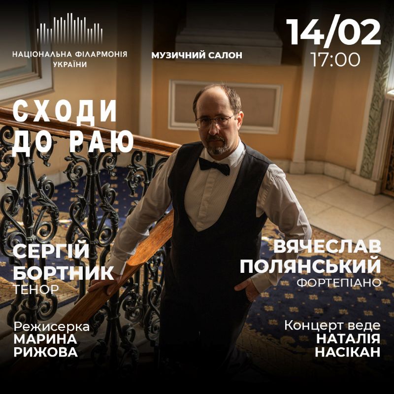 14 лютого у програмі «Сходи до раю» у виконанні соліста філармонії тенора Сергія Бортника та джазового піаніста В’ячеслава Полянського прозвучать пісні з голлівудських мюзиклів та кінофільмів, спірічуелси, фортепіанні джазові імпровізації: саме та музика, яка повинна звучати у День закоханих. Публіка матиме чудову нагоду пригадати атмосферу культових фільмів та мюзиклів «Кабаре», «Ні, ні, Нанетта», «Історія кохання», «Моя чарівна Леді», насолодитися Гершвіном і джазовими імпровізаціями. Родзинки концерту додадуть також відомі спірічуелси.