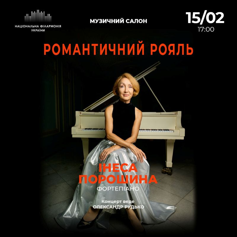 15 лютого звучатиме «Романтичний рояль» Інеси Порошиної. Програма побудована на красі протилежностей геніїв і складатиметься з творів Шопена, Шумана, Дебюссі з їх безпосередністю у музичних висловах, багатством наспівних мелодій та геть іншого Ліста – патосного оратора, що користується підкресленою віртуозністю, аби висловити щось важливе, вічне, неймовірне. Компанію їм складуть твори українських композиторів, яких не оминуло романтичне натхнення: Косенка, Некрасова, Надененка.