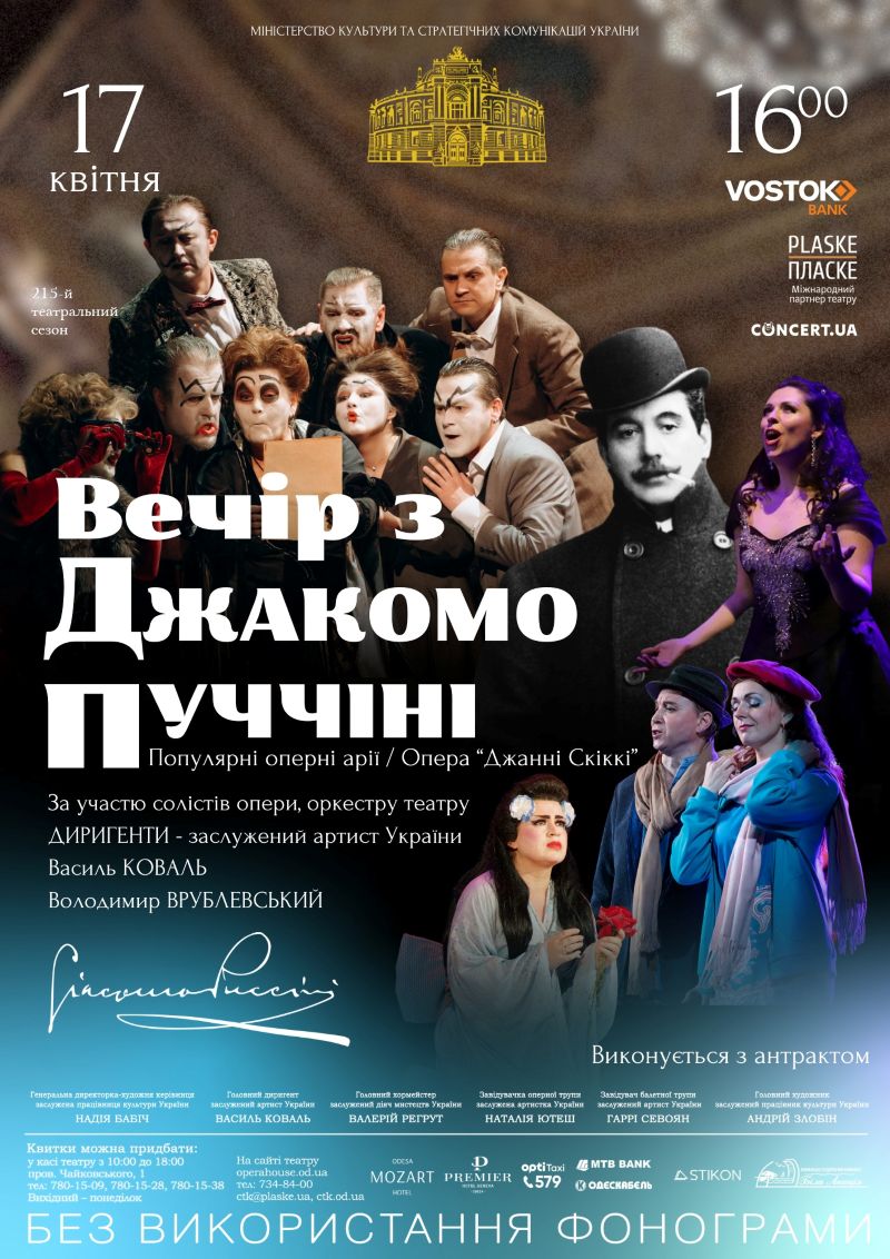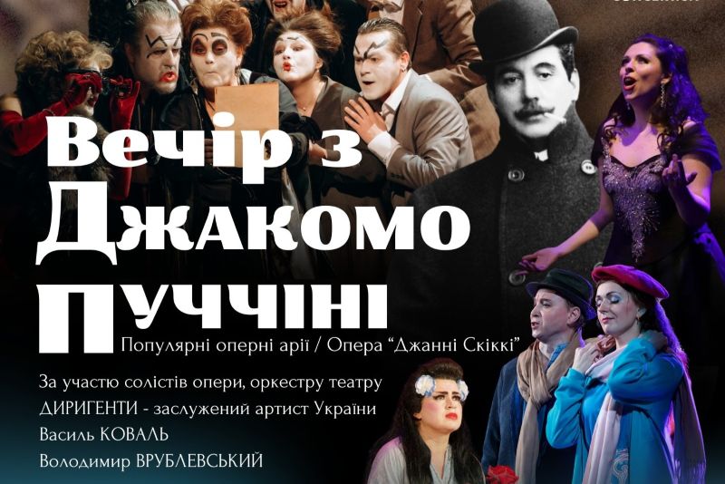 Глядачів запрошують на концертну імпрезу, присвячену творчості Джакомо Пуччіні. У цей вечір на сцені театру з вами зустрінуться Тоска і Каварадоссі («Тоска»), Калаф («Турандот»), Мюзетта, Мімі та Рудольф («Богема»), Чіо - Чіо - сан («Мадам Баттерфляй»); прозвучать інструментальні твори з опер «Сестра Анджеліка» та «Манон Лєско». У другому відділенні представимо одноактну комічну оперу «Джанні Скіккі» з відомого Пуччінівського «Триптиху», яка чарує легкістю і дотепністю.
