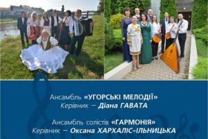 «Гармонія» та камерно-інструментальний ансамбль «Угорські мелодії». Перший колектив виконає такі всенародно улюблені пісні, як «Ой, під вишнею», «На вулиці скрипка грає», «Ой казала мені мати», «Не буду ся женити», «Ой, я знаю, що гріх маю» в музичних обробках М.Лисенка, С.Гулака-Артемовського, С.Мартона, В.Гнатишина, Є.Чорнокондратенка , а з популярних зарубіжних мелодій – «Besame Mucho» К.Веласкес, «Granada» А.Лари, «Oblivion» А.П’яццоли, «Молдавський танок» О.Мунтяна та ін. У супроводі інструментального ансамблю під керівництвом Анастасії Жужгової соло виконають заслужена артистка України Оксана Ільницька-Хархаліс (мецо сопрано, керівник колективу), Марина Лавра (сопрано), Михайло Подкопаєв (бас), Євген Цанько (акордеон).