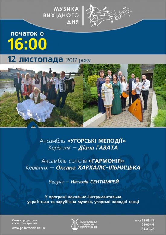 А другий колектив представить в’язанки угорських народних пісень, кілька запальних чардашів та арії з відомих оперет. Солісти – Оніко Нодь (сопрано), Іштван Халус (тенор) і танцювальна пара у складі Андріани Торбич та Іштвана Кекерченя. Керівник колективу – Діана Гавата. Краса й багатство українського мелосу, самобутність угорської культури, романтизм мексиканських мелодій у виконанні найяскравіших артистів філармонії неодмінно подарують слухачам гарний настрій на весь недільний вечір. Концерт відбудеться у рамках проекту «Музика вихідного дня».