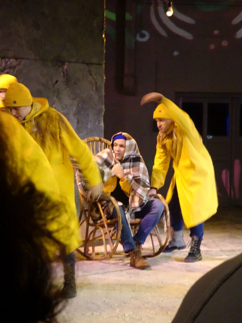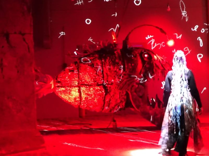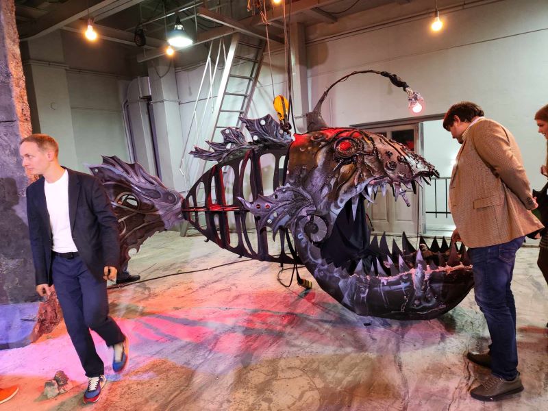 Динамічною кульмінацією вистави є поява з бокового металевого боксу страхітливої величезної залізної моделі риби-вудильника в стилі стімпанк, яка зі скрипом пересувається на блоках по пів периметру зали і тут же розбирається рибалками з мімансу до оголеного каркасу – ще один символ внутрішнього подоланого жаху.