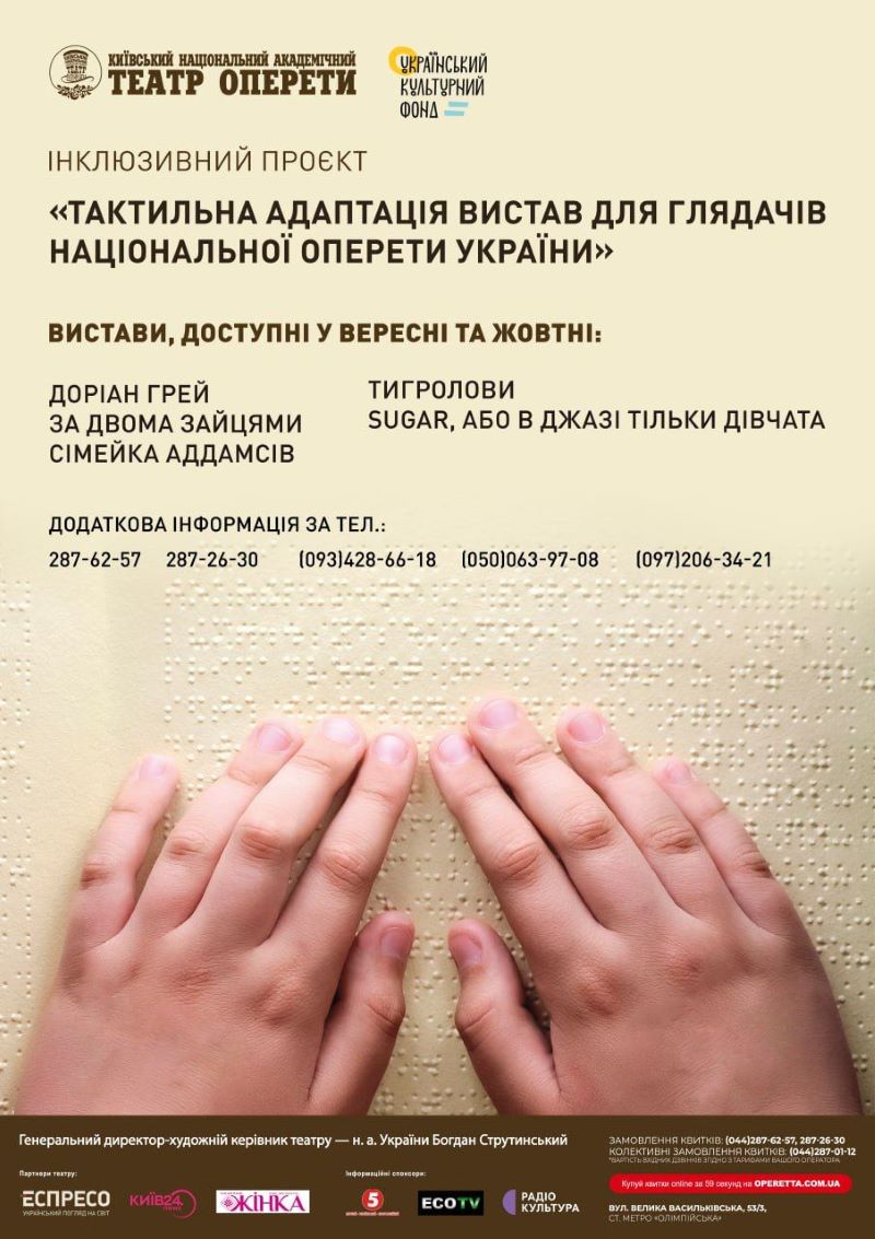 До п’ятьох різножанрових вистав були створені аудіодискрипція, підготовлені тактильні книжки, які представлять декорації та костюми кожної вистави, театральні програмки шрифтом Брайля та описовий тур до двадцяти інших вистав театру. Це дозволить надавати послугу для глядачів з повним/частковим порушенням зору максимально комфортно.