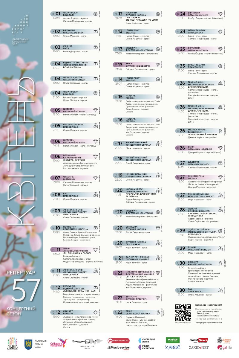 А ще – “Пори року” Вівальді у дуеті скрипки та органа (1, 4, 13 і 14 квітня) та Екскурсія Органним залом (12 квітня).