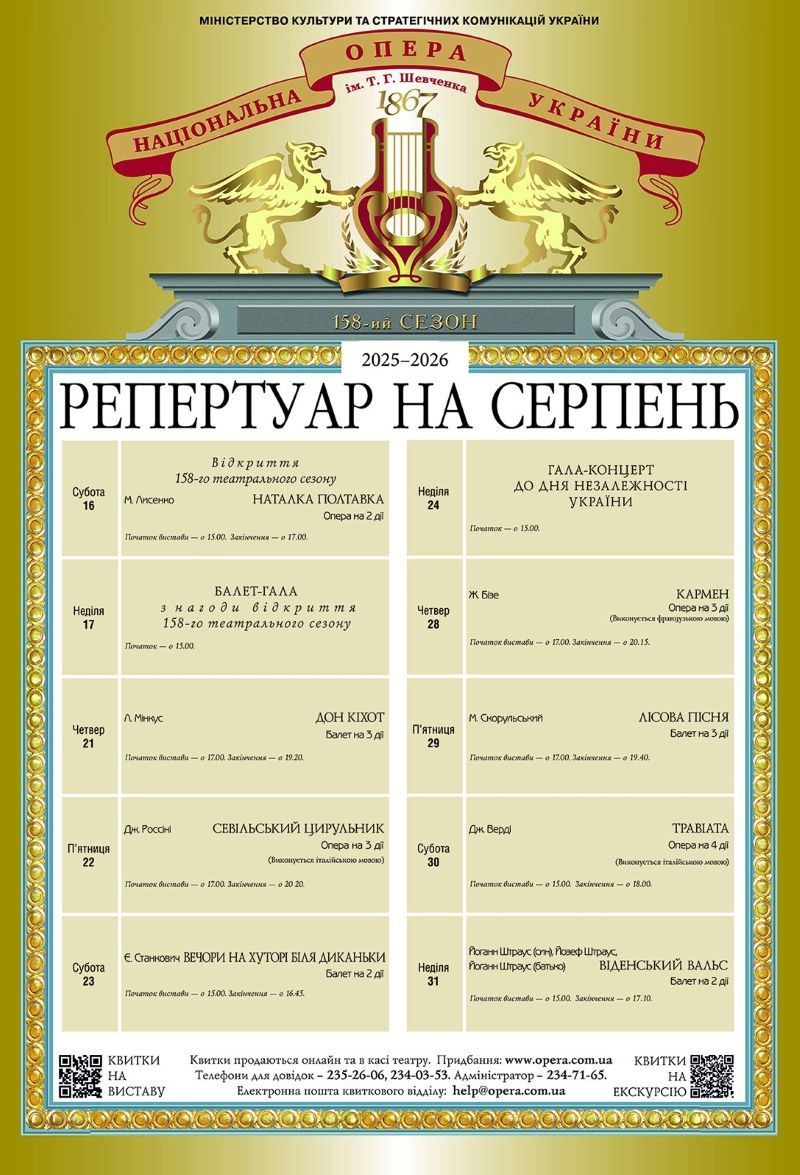 17 серпня глядачі побачать яскравий концерт «Балет-Гала», який присвячений відкриттю нового театрального сезону. В серпневій афіші окрім Гала-концерту з нагоди Дня Незалежності України (24 серпня), який традиційно стане домінантою серпня, заявлені кращі взірці світової та української оперної та балетної класики.