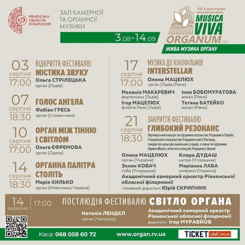 Зауважимо, що Міжнародний фестиваль органної музики Musica Viva Organum вже восьмий рік проходить у Рівному. Організатори зазначають, що назва фестивалю символічна, адже в теплу пору року орган починає звучати по- особливому.
