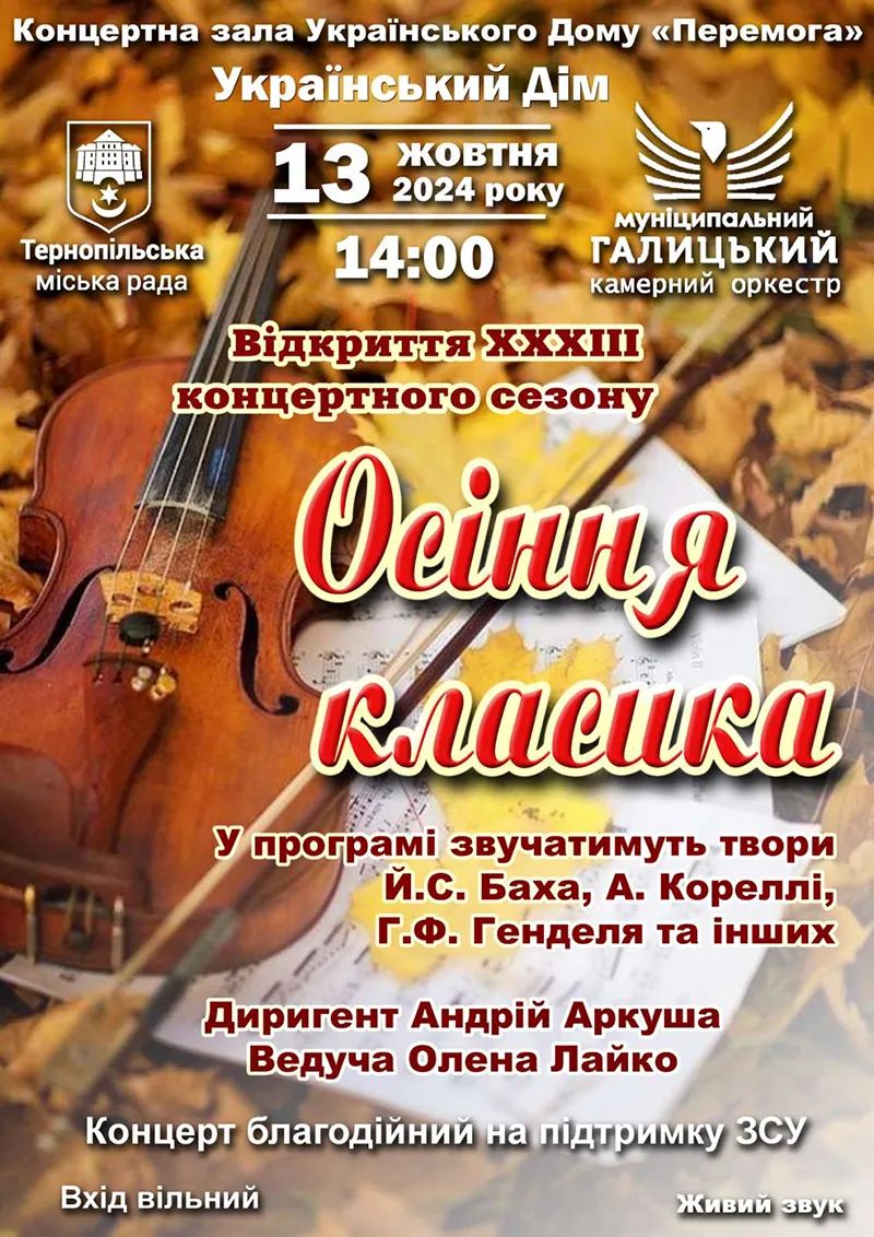 ХХХІІІ-тій концертний сезон відкриває цьогоріч Муніципальний Галицький камерний оркестр 13 жовтня. Програма матиме назву "Осіння класика". На думку артистів, саме класична музика здатна урівноважити і заспокоїти, стримати і втішити у наш непростий воєнний час, який постійно нагадує про себе, змушує тривожитись, хвилюватись та міряти ним усе наше сучасне життя.