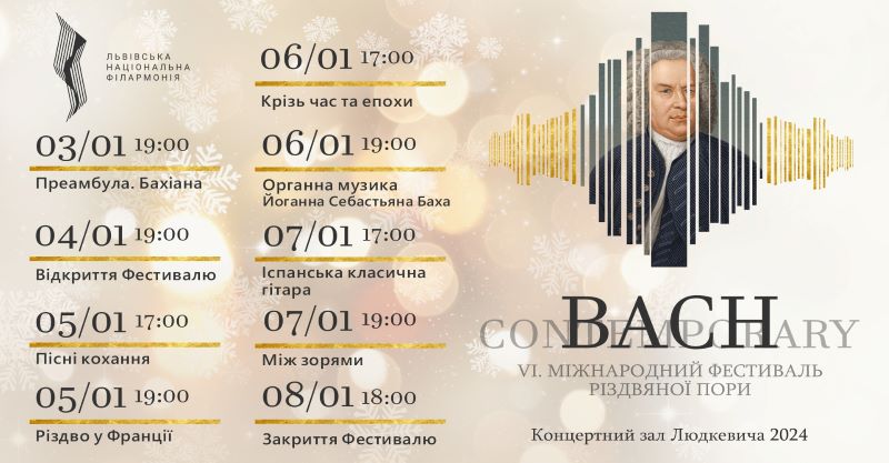 Попри те, що фестиваль присвячений легендарному композитору, впродовж девʼяти подій звучатиме музика не лише Баха, а й митців інших епох та навіть кіномузика! «BACH CONTEMPORARY» – це чудова нагода відкрити для себе світ музики Йоганна Себастьяна Баха, провести час з близькими людьми та розпочати рік музичними шедеврами епохи бароко!
