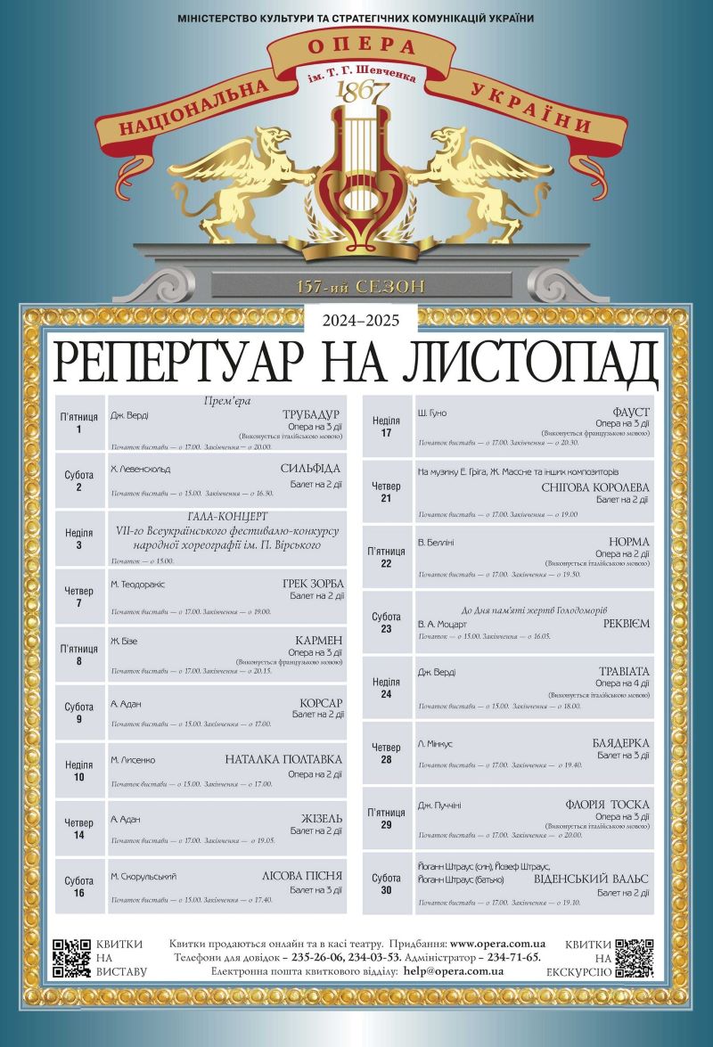 10 листопада (неділя) о 15:00 - перлина українського оперного мистецтва «Наталка Полтавка» Миколи Лисенка. Музична редакція Мирослава Скорика. Сценічна редакція Анатолія Солов’яненка.