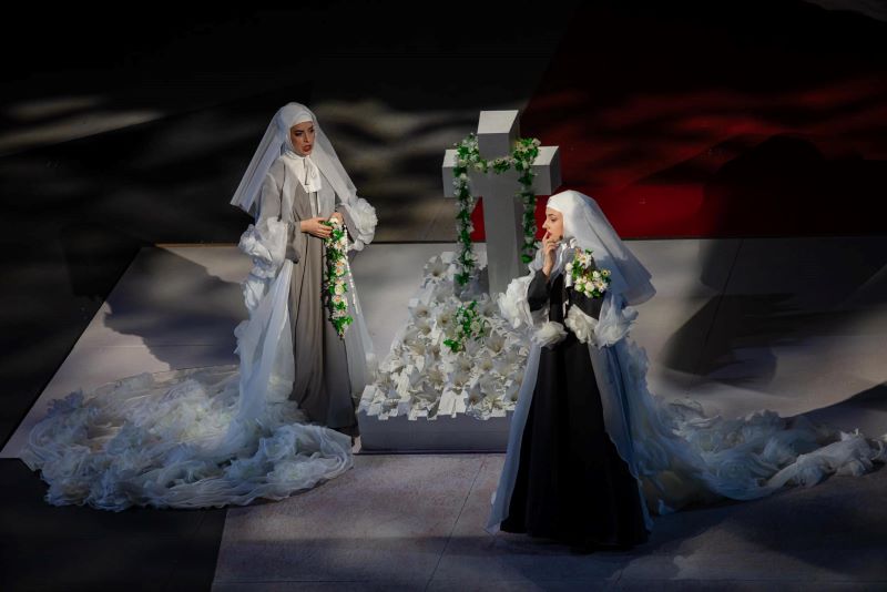 Драматургія побудована на антитезі контрастних персонажів Матері Марі де л’Інкарнасьон (сестри втілення) і Бланш де ла Форс (сестри мук Ісусових), на їх життєвому виборі у час адаптації послушниці в сестринстві і в реаліях революційного розгулу. Тож перед нами безліч мізансцен побудованих на їх діагоналях і контрастах прояву. Велике значення мають символічні деталі: іграшковий зайчик який для Бланш є втіленням родинного тепла, і фігурка немовлятка Ісуса — як народження надії на спасіння, яка несподівано/символічно розбивається.