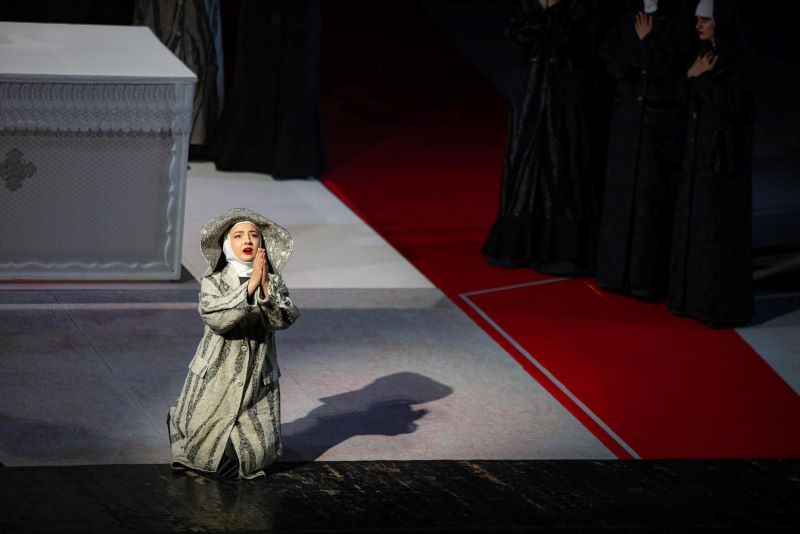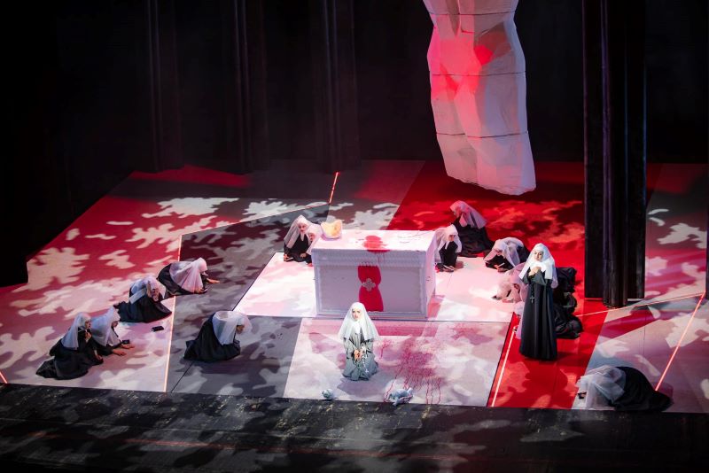 При всій трагедійності і жахливих реаліях змісту — жодного відразливого натуралізму, виходу за межі естетики, проте все сказано і підкреслено максимально рельєфно: паралелізм смертної постелі абатиси і розхристаної шалі Бланш де ля Форс в зруйнованій батьківській бібліотеці, гранений профіль монахині за мереживом ґрат — наче з ренесансних полотен Ван Ейка і колони храму, які розпадаються на списи, рухомі силуети розперезаного озброєного натовпу на білому заднику і криваві патьоки вина по білосніжному престолу — все це красномовно промовляє до кожного в залі, залишаючи місце уяві.