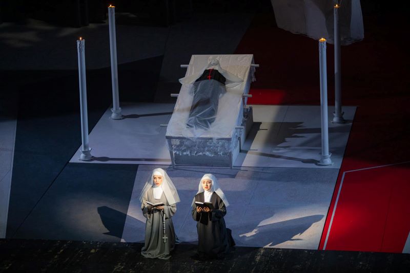 Хормейстер-постановник — Вадим Яценко: хорові сцени тут — і змалювання монашого сестринства, і стан їхніх думок, і символ мучеництва. Вони модерні і поліфонічні (як у Монтеверді чи Джезуальдо), вони кристалічно чисті й досконалі як сльоза, і обране звукоутворення, ансамблевість, соло — все було винятково важливим, і в кожній зі сценічних ситуацій — вирішальним для цілого. Матовий тембр для молитви a cappella, інтенсивний та ідеально ансамблевий для молитви перед ликом Ісуса і — вражаючий! — хор в небесах — з третього балкону в сцені страти — це справді блискучі знахідки, які влучили в серце кожного.