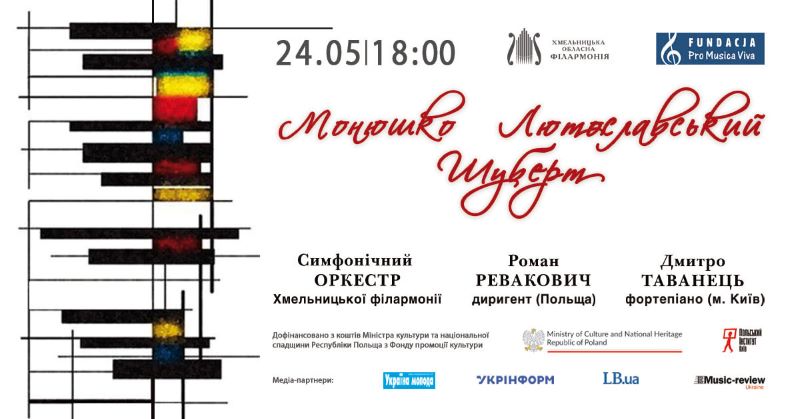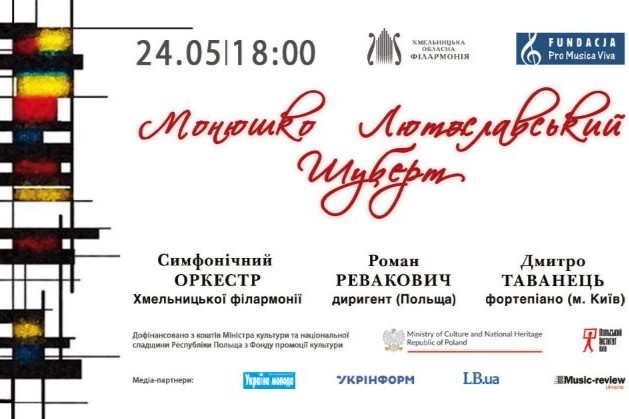В програмі найближчого концерту 24 травня у Хмельницькій філармонії за участю симфонічного оркестру та соліста Дмитра Таванця прозвучать увертюра «Байка» Станіслава Монюшка, фортепіанний концерт Вітольда Лютославського та симфонія До-мажор «Велика» Франца Шуберта.
