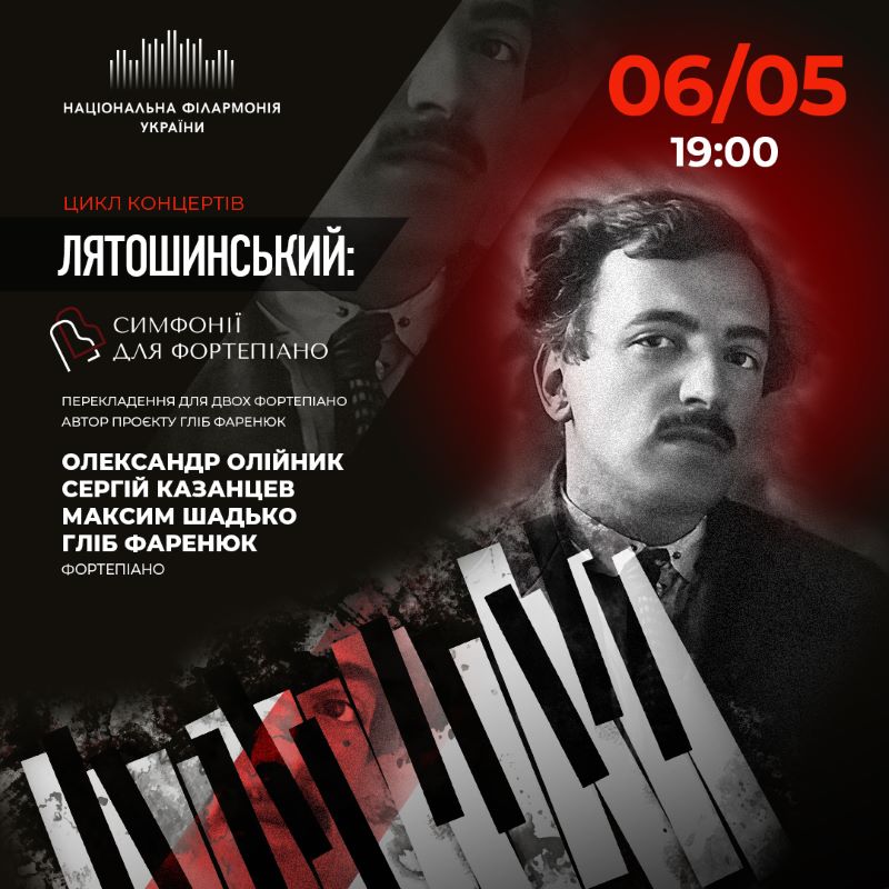 6 травня – чотири піаністи: Гліб Фаренюк, Максим Шадько, Сергій Казанцев, Олександр Олійник заграють Другий концерт циклу «Лятошинський: Симфонії для фортепіано», у центрі якого – транскрипція «Слов’янської» Симфонії №5. Завершена 1967 року – за рік до смерті видатного українського композитора, вона стала останньою симфонією в доробку Бориса Лятошинського.