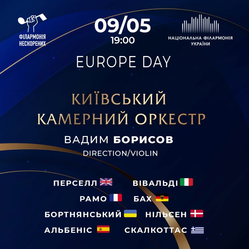 9 травня – святкування Дня Європи, до якого долучається і Київський камерний оркестр. під керівництвом Вадима Борисова, direction / violin. Прозвучить програма, що включає музику композиторів різних епох та країн: Генрі Перселла, Антоніо Вівальді, Жан-Філіппа Рамо, Карла Філіппа Емануїла Баха, Дмитра Бортнянського, Карла Нільсена, Ісаака Альбеніса, Нікоса Скалсоттаса.