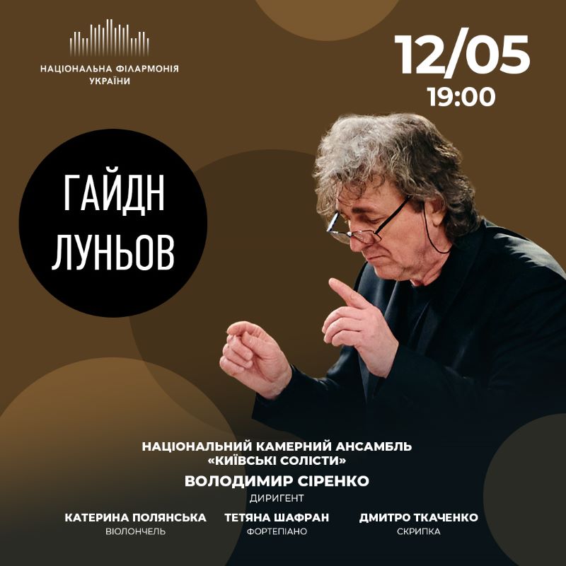 12 травня Національний ансамбль «Київські солісти» під керівництвом диригента Володимира Сіренка представить програму, у якій поєднуються твори українського композитора Святослава Луньова та австрійця Йозефа Гайдна. Плинність та густота звучання «Libera me» відтіняється лаконічною та виваженою музикою Гайдна. Втім і в ній знаходиться місце для схвильованості та меланхолійності, що резонують із проникливістю твору Луньова. Разом це дає змогу по-інакшому почути музику давно відомого Гайдна. Солісти: Катерина Полянська/віолончель; Тетяна Шафран/фортепіано та Дмитро Ткаченко/скрипка.