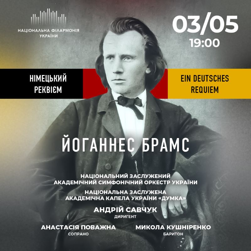 3 травня, у Страсну п’ятницю, – Національний симфонічний оркестр України та Національна капела України ДУМКА під орудою диригента Андрія Савчука виконають «Німецький реквієм» Йоганнеса Брамса. Солісти: Анастасія Поважна/сопрано, Микола Кушніренко/баритон.