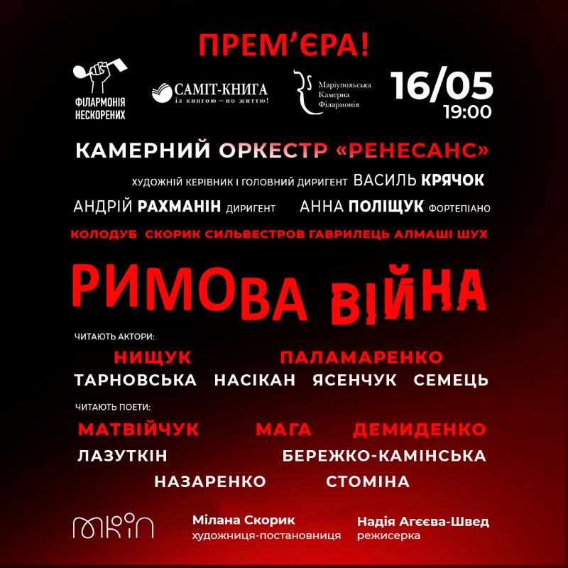 16 травня – мультидисциплінарний проєкт «Римова війна», що поєднує у собі поезію, музику і візуальне мистецтво. Його початком став вихід однойменної збірки поезій, де містяться вірші українських авторів, які осмислюють власний досвід існування в умовах воєнного стану. Вибрані поети представляють різні регіони України, відтак проживають кожен свої історії: хтось нищить ворога на фронті, хтось перебуває в окупації чи евакуації, одні волонтерять, інші проживають біль втрати.