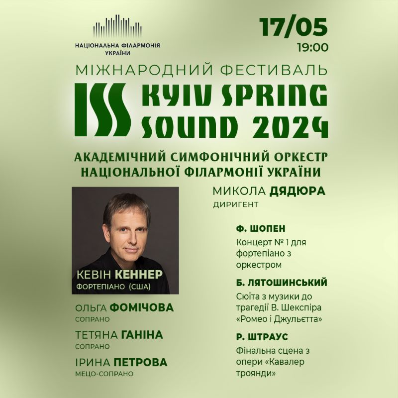 17 травня американський піаніст Кевін Кеннер, який спеціалізується на виконанні творів поляка Фридерика Шопена, – виконає його Концерт №1 для фортепіано з оркестром. У програмі цього вечора також прозвучать Сюїта Бориса Лятошинського з музики до театральної постановки «Ромео і Джульєтта», партитуру до якої нещодавно віднайшли.