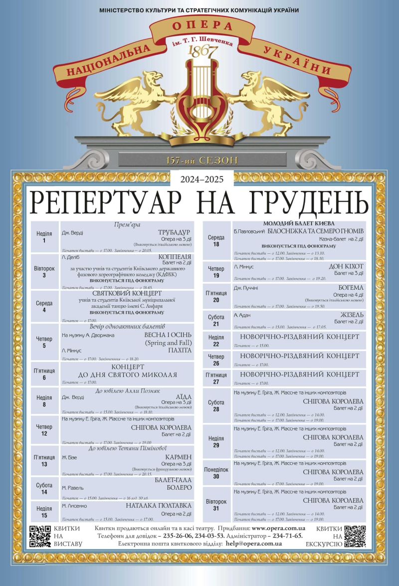 Ті, хто не встиг побачити останню прем’єру Національної опери, матимуть нагоду оцінити нову постановку режисера Віталія Пальчикова - опери «Трубадур» Дж. Верді вже за участі «італійського творчого десанту» - тенора Франческо Конджу та диригента Стефано Торболі. А ще в грудні на глядачів чекають: зустріч із зіркою світової оперної сцени Людмилою Монастирською, бенефіси Алли Позняк та Тетяни Пімінової (прекрасні мецо-сопрано), концерти та вистави молодого балетного покоління з хореографічних навчальних закладів.