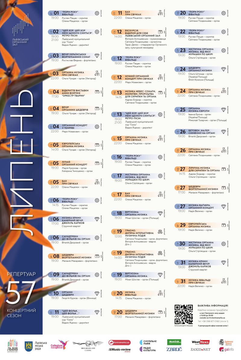 Органний зал не йде у відпустку – липень тут буде насиченим, музичним і незабутнім. Заплановано понад 50 подій. Це виступи запрошених органістів, у тому числі гастролі солістів з Польщі, особливі камерні програми кримськотатарської музики у виконанні струнного квартету, фортепіанні речиталі, дует скрипки й органа, атмосферні концерти при свічках. А ще – нові програми та улюблені бестселери від солістів-органістів та камерного хору “Гомін”. Тож під час літньої відпустки відвідувачі можуть продовжувати насолоджуватися вишуканою класикою та прохолодою за товстими мурами Органного залу.