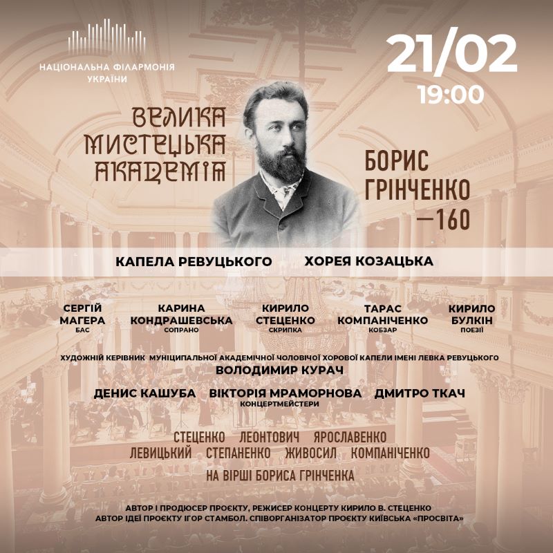 Унікальна програма концерту «Борис Грінченко-160» 21 лютого, – включає рідко виконувані твори на вірші ювіляра – натхненника боротьби за українську ідентичність та державну незалежність на зламі ХІХ-ХХ ст. Класичні хори й романси Кирила Стеценка, Миколи Леонтовича, Модеста Левицького та Михайла Степаненка контрастуватимуть із сучасними кобзарськими піснями й баладами Тараса Компаніченка і Василя Живосила. Окрасою вечора очікуються виступи володаря розкішного басу, світової зірки оперної сцени Сергія Магери та чарівної сопрано, солістки Національної філармонії Карини Кондрашевської. Серед сюрпризів програми – виконання твору «Ще не вмерла» у трьох версіях: для скрипки соло; з хоровою музикою Кирила Стеценка; в літературному переспіві Бориса Грінченка. Стійкий естетичний післясмак події ще довго бринітиме голосами «Хореї Козацької», «Капели Ревуцького» та оригінальними поезіями класика в інтерпретації ведучого Кирила Булкіна.