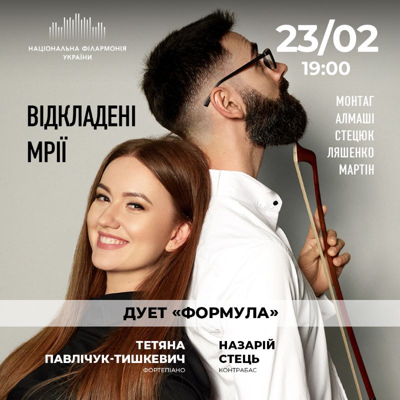 23 лютого в концерті «Відкладені мрії» відбудеться ще один дебют на сцені філармонії Duo Formula у складі контрабасиста Назарія Стеця та піаністки Тетяни