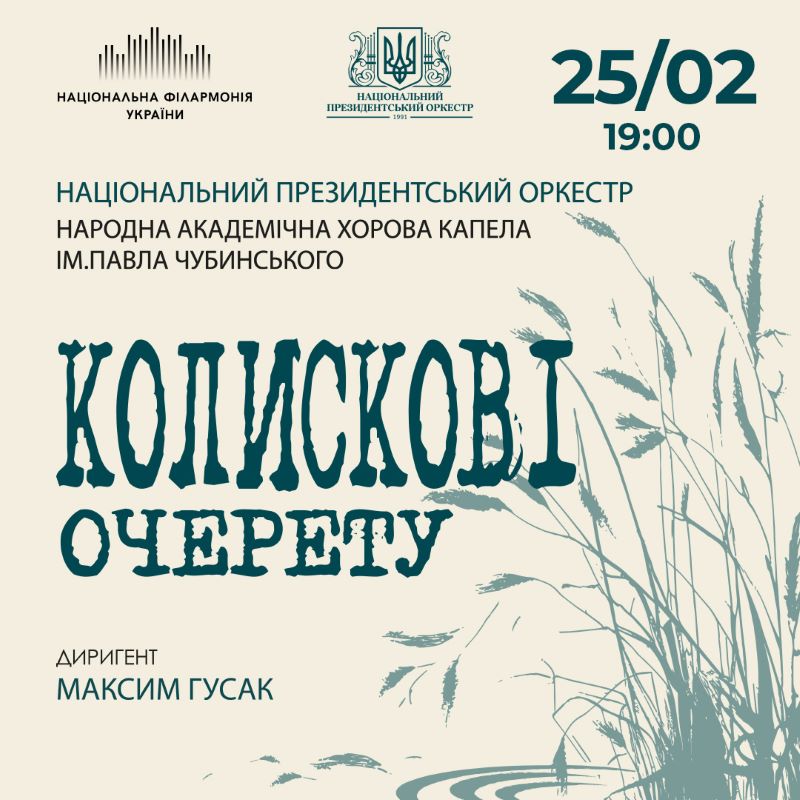 25 лютого – продовження теми у концерті «Колискові очерету», який Національний Президентський Оркестр (симфонічний оркестр) під орудою Максима Гусака та Народна хорова капела ім. Павла Чубинського присвячують пам’яті кожного, хто загинув у кривавій війні: полеглих на полі бою захисників, невинно убієнних російським терором мирних громадян.