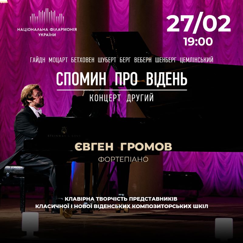 27 лютого знаний український піаніст Євген Громов представить другий концерт із авторського циклу «Спомин про Відень», де прозвучить клавірна творчість представників класичної й нової віденських композиторських шкіл: Й. Гайдна, В. А. Моцарта, Л. Бетховена Ф. Шуберта, А. фон Веберна і прем’єра в Україні: Чотири балади Олександра фон Цемлінського та 12 варіацій на власну тему Альбана Берга.