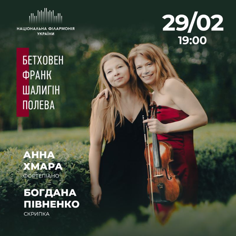 29 лютого зірковий дует скрипальки Богдани Півненко та піаністки Анни Хмари подарують вишуканий вечір української камерної музики. Де б музикантки не виступали, у програмах їхніх концертів завжди присутня українська музика, яку вони активно пропагують як на національному, так і на світовому рівні. Програма нинішнього концерту представить твори сучасних українських композиторів – Максима Шалигіна та Вікторії Полевої.