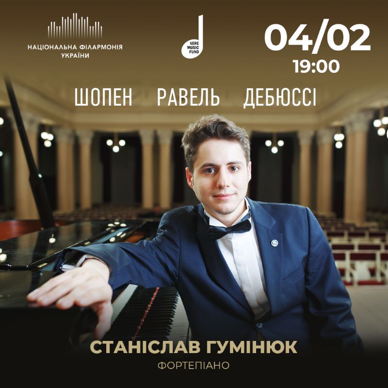 4 лютого ввечері, о 19:00 перший сольний концерт піаніста Станіслава Гумінюка на сцені Національної філармонії представить твори Клода Дебюссі, Моріса Равеля та Фридерика Шопена, які були відомі також і як успішні піаністи, тож їх опуси є еталонними і дозволяють виконавцю продемонструвати високу майстерність володіння інструментом.
