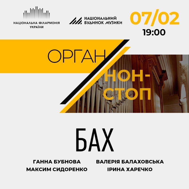 7 лютого Орган нон-стоп: Бах, який можна назвати справжнім святом органа, де виступлять найкращі органісти України, солісти Національного будинку музики, Ірина Харечко, Валерія Балаховська, Ганна Бубнова і Максим Сидоренко.